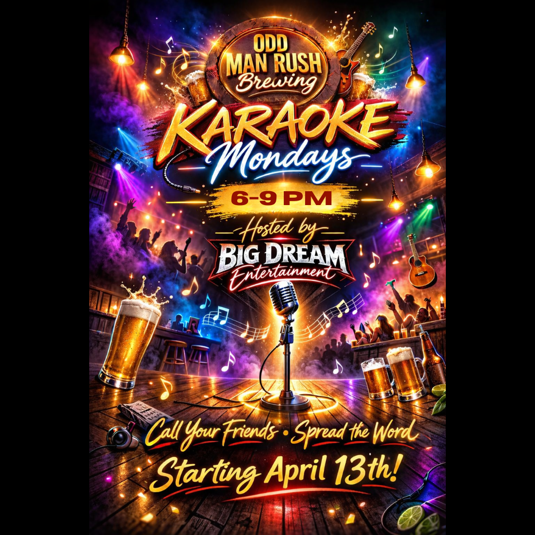 Karaoke Mondays at Odd Man Rush Brewing. Start your week on a high note! Join us every Monday from 6–9 PM for a night of karaoke, great drinks, and unforgettable performances. Hosted by Big Dream Entertainment, you’ll have access to an awesome song selection and top-notch sound—whether you’re a seasoned performer or just singing for fun. Cold beer, cocktails, and wine!